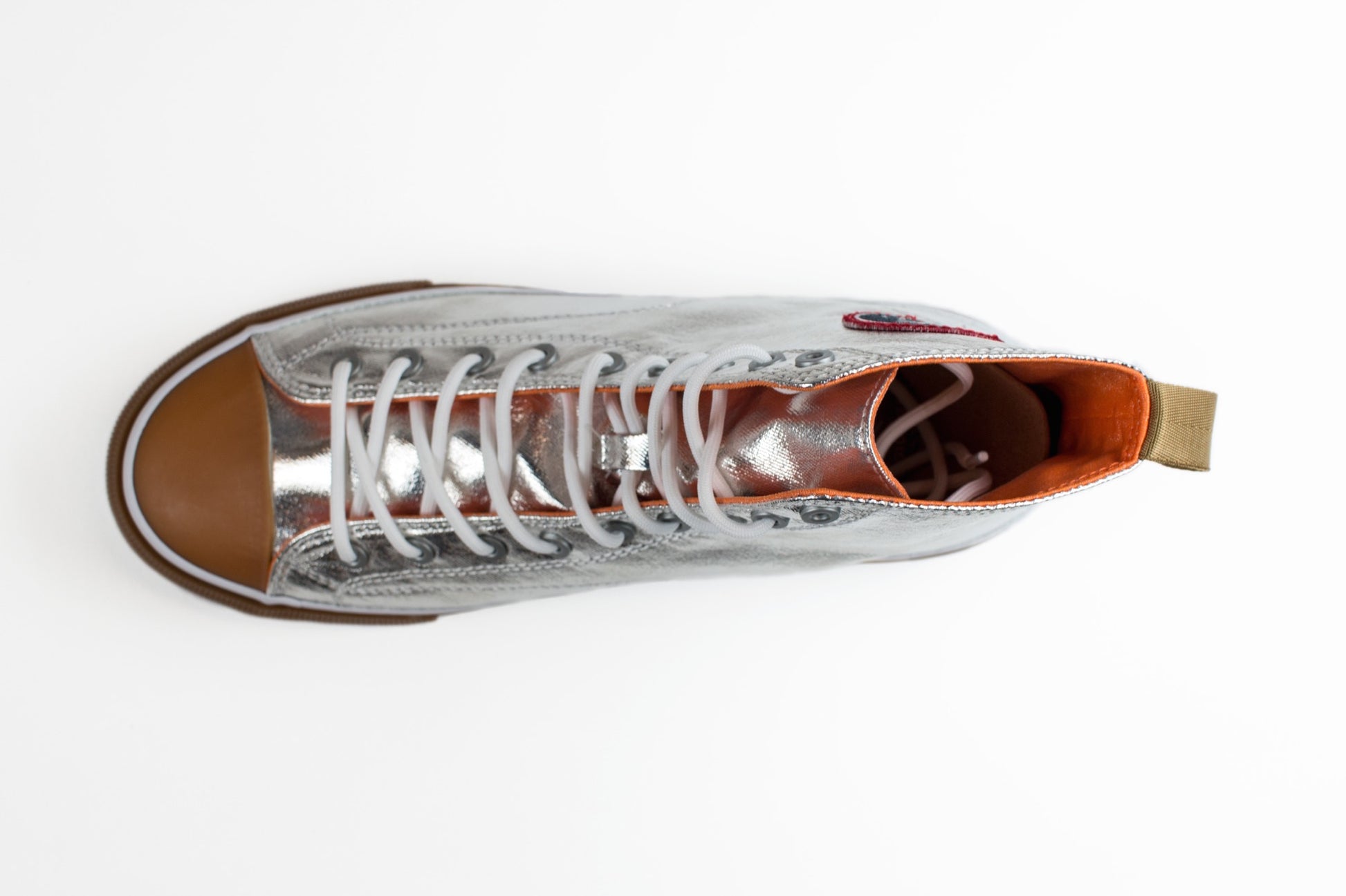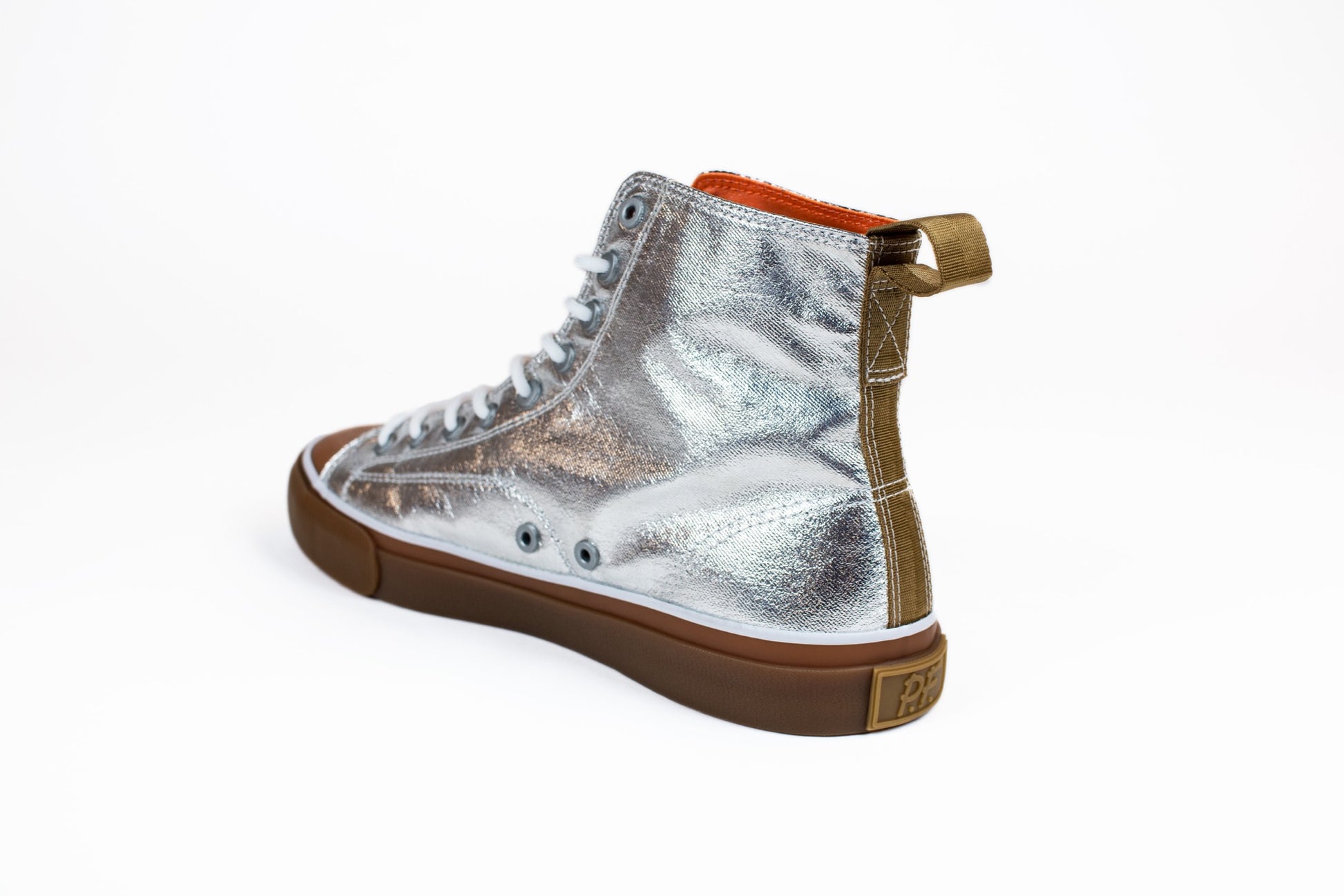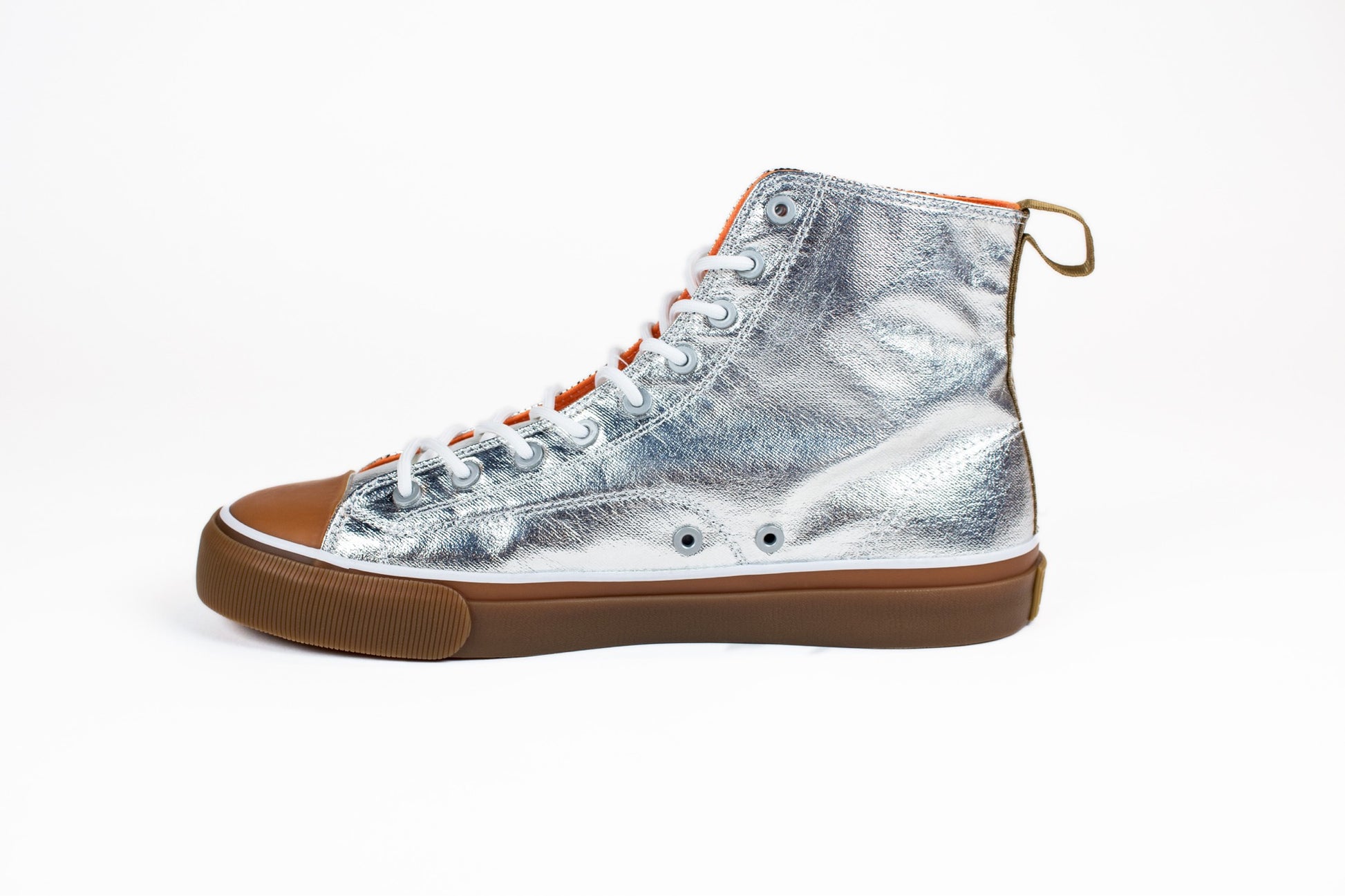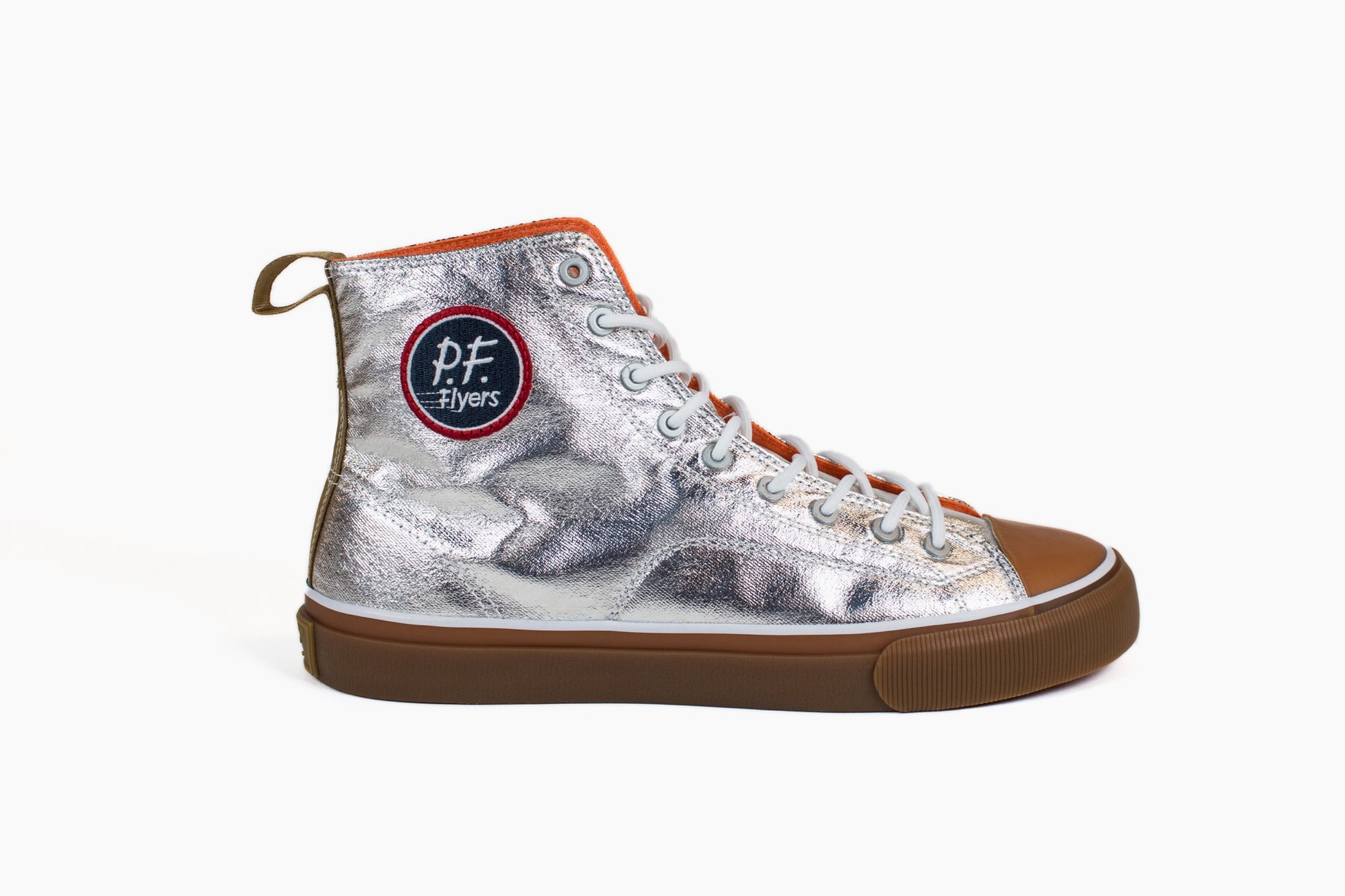 We've reproduced the PF Flyer All American silhouette as worn by the Mercury 7 astronauts in the spec materials used on the original spacesuit and space capsule. The high top sneaker features an aluminized nylon nomex upper, which is heat resistant to 3000°F*, nickel-alloy eyelets like the material used on the Mercury space capsule, a hi-visibility orange lining, a heel pull-tab, and paracord laces.