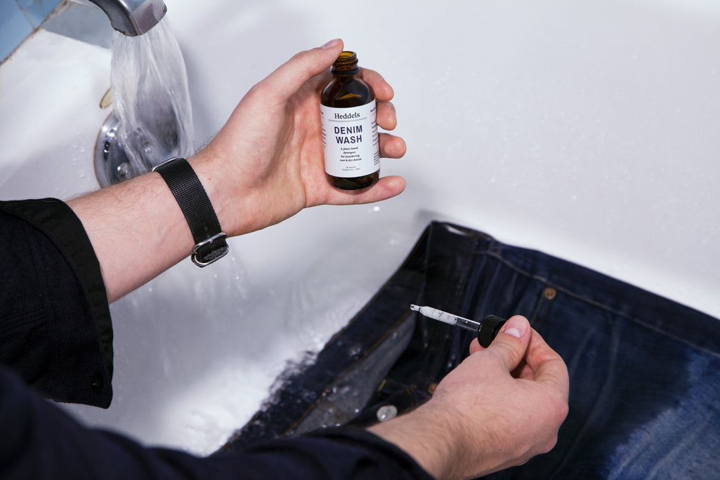Run lukewarm bath. Add 2-4 droppers detergent. Add jeans and fill tub until jeans are submerged. Let sit 30 mins. Drain tub and fill with cold water. Let sit 10 mins. Drain tub and hang jeans to dry.